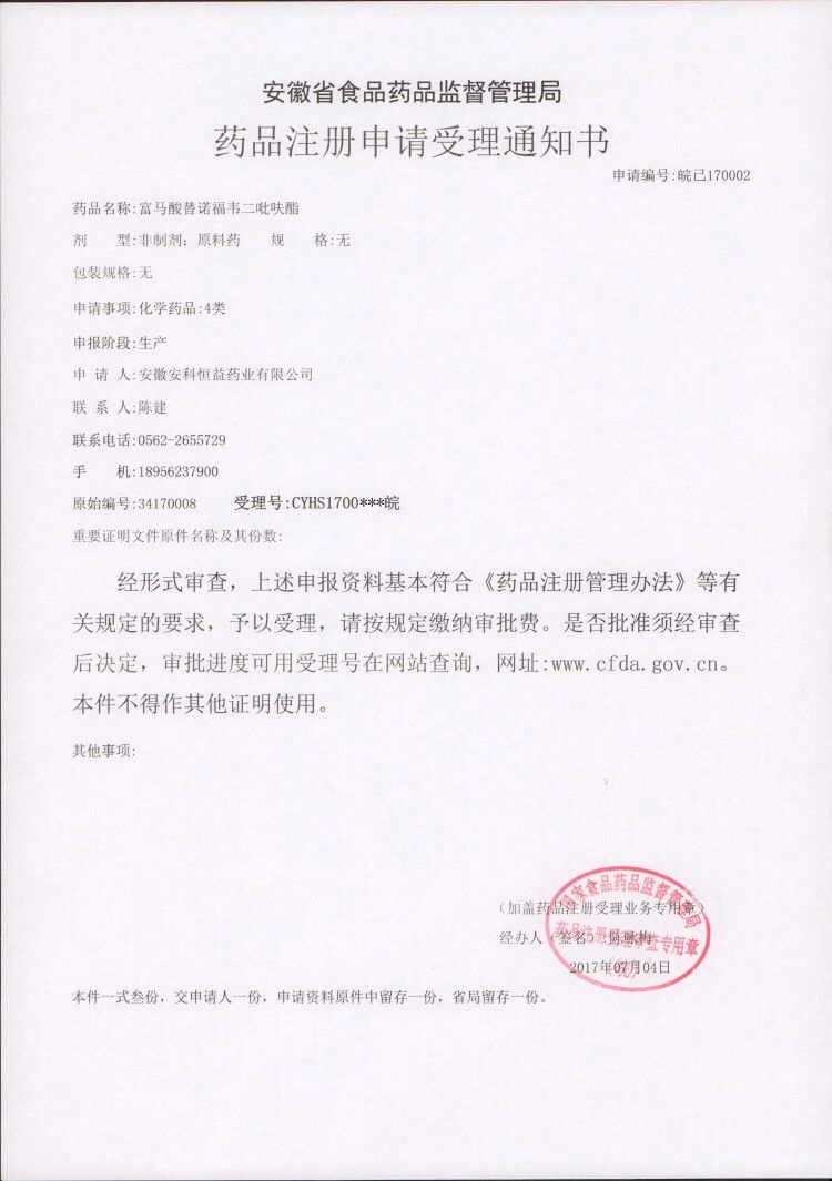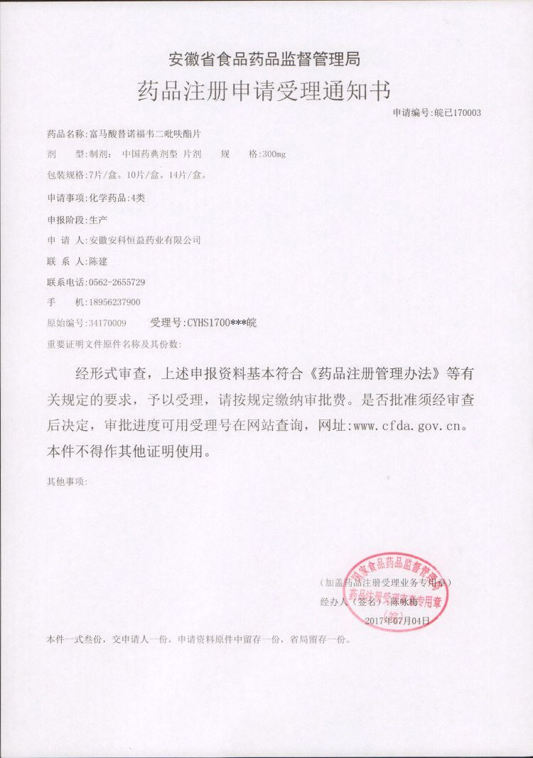 2017年7月4日,安徽安科恒益藥業(yè)有限公司新藥品種——富馬酸替諾福韋二吡呋酯及富馬酸替諾福韋二吡呋酯片申請(qǐng)生產(chǎn)注冊(cè),已取得藥品注冊(cè)申請(qǐng)受理通知書(shū)。