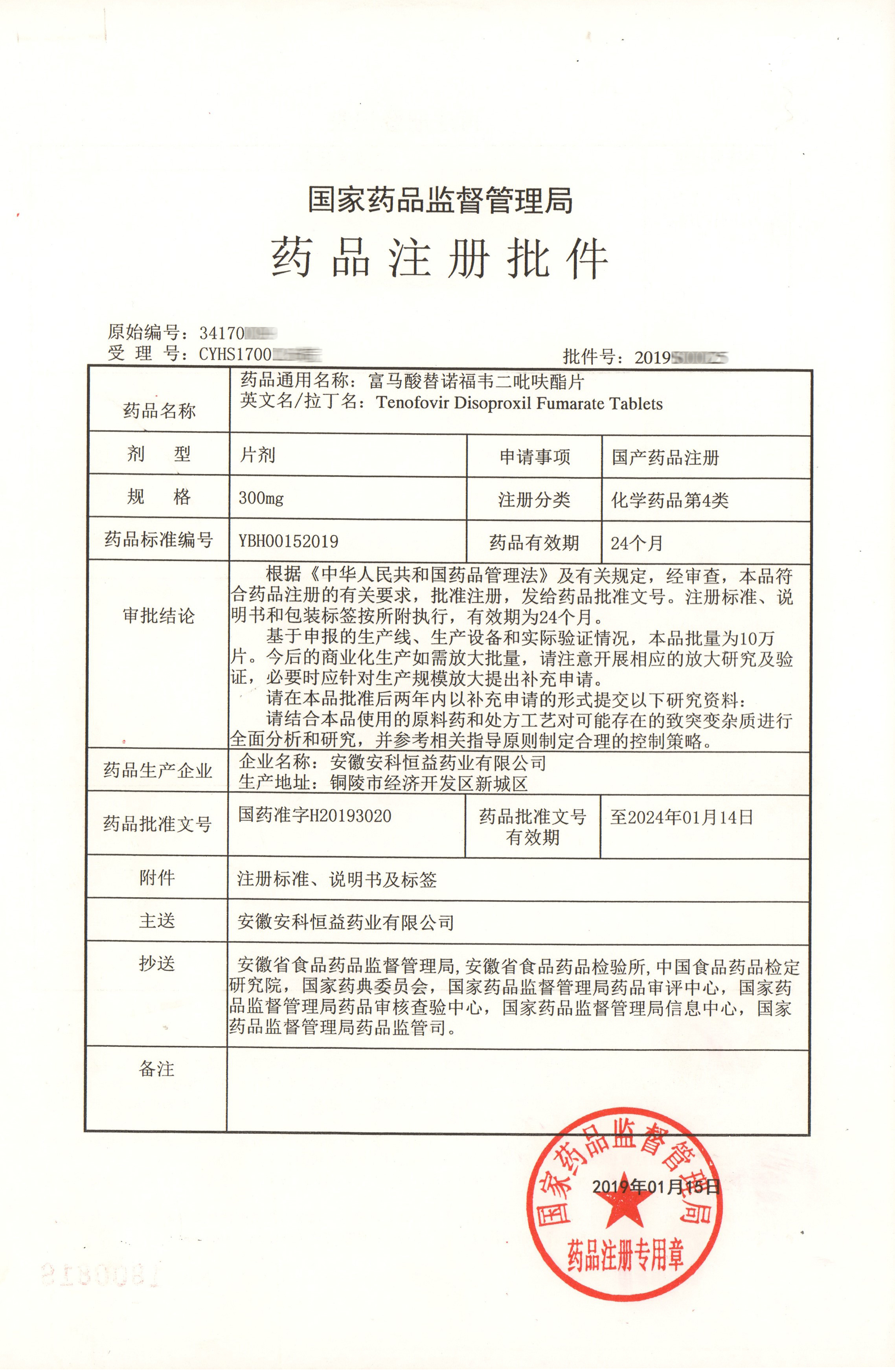 2019日年1月25日,安徽安科恒益藥業(yè)有限公司收到國家藥品監(jiān)督管理局核準(zhǔn)簽發(fā)的關(guān)于富馬酸替諾福韋二吡呋酯片劑的《藥品注冊批件》,并同時通過仿制藥質(zhì)量和療效一致性評價。這是集團公司安科生物及我公司安科恒益盼了近五年所獲得的化學(xué)仿制藥,獲批消息傳來,全公司上下歡呼振奮。